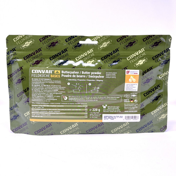 Das Produkt wurde sorgsam unter Schutzatmosphäre in einem CONVARTM Soft-Pouch verpackt, der optimalen Schutz für das Langzeitlebensmittel bietet und die spezifischen Kriterien des U.S. Militärs für flexible Verpackungen erfüllt (MIL-PRF-44073H). Die sechsschichtige Verpackung ist BPA-Frei, wasserdicht und besitzt einen integrierten Zipper, der ein einfaches Wiederverschließen nach Entnahme ermöglicht.
